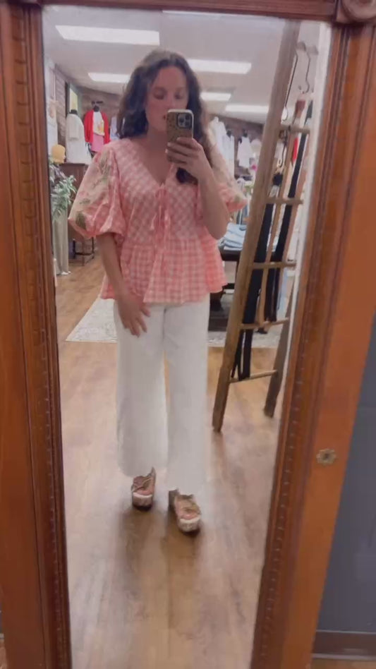 Spring Embroidery Bouquets Coral Gingham Blouse (Small to Large)