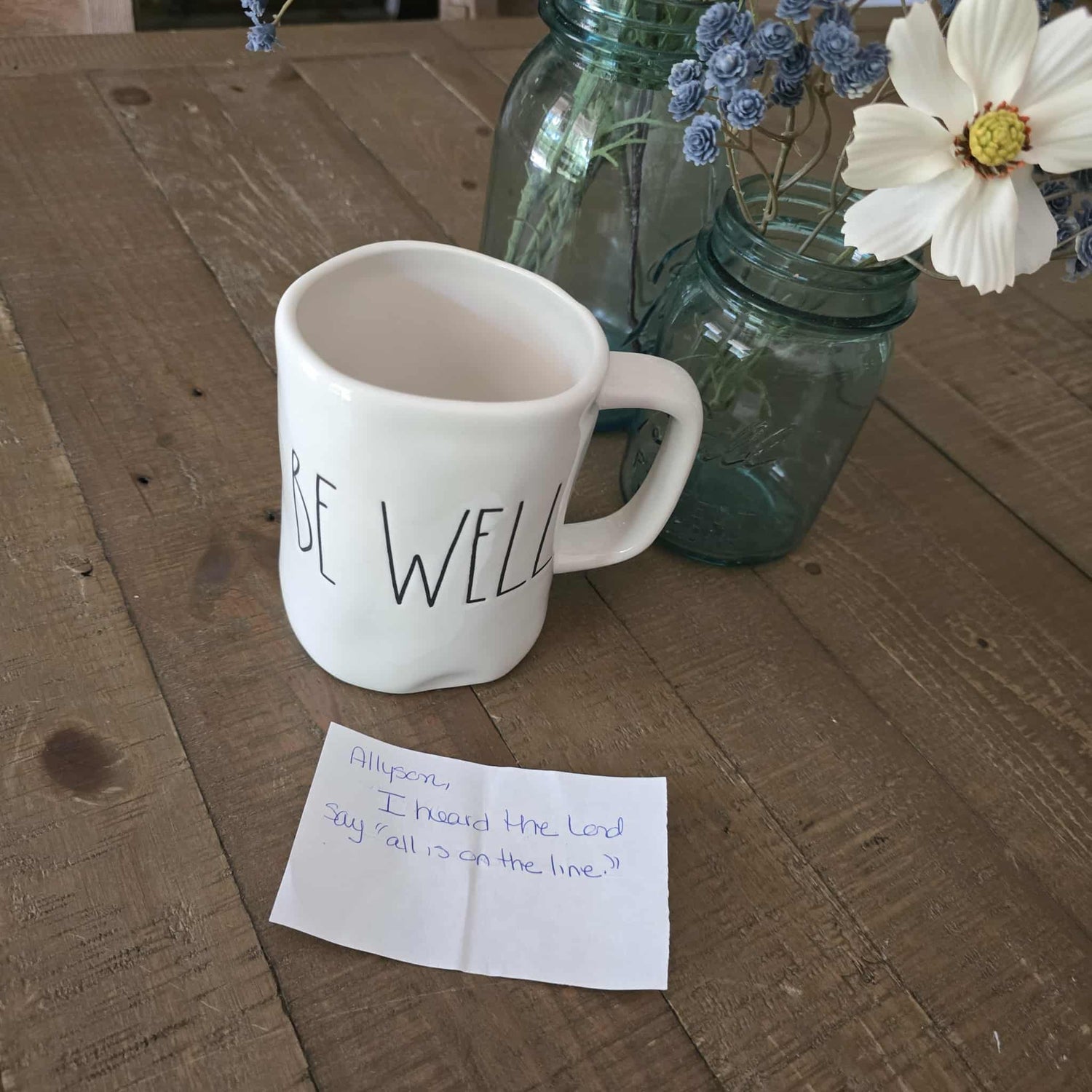 This is an open letter to the one who wrote a word from the Lord and left it in my cup at the beach retreat. It has taken me quite some time to read this note again. The note said, Allyson- I heard the Lord say "all is on the line".Â