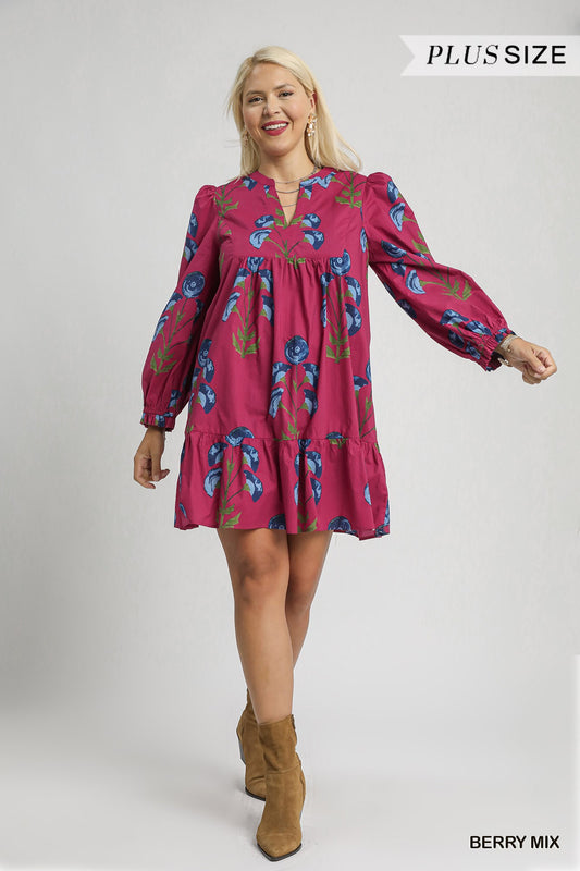 Rumors Plus Size Boho Print Long Sleeve Dress with Ruffle (1XL to 3XL)