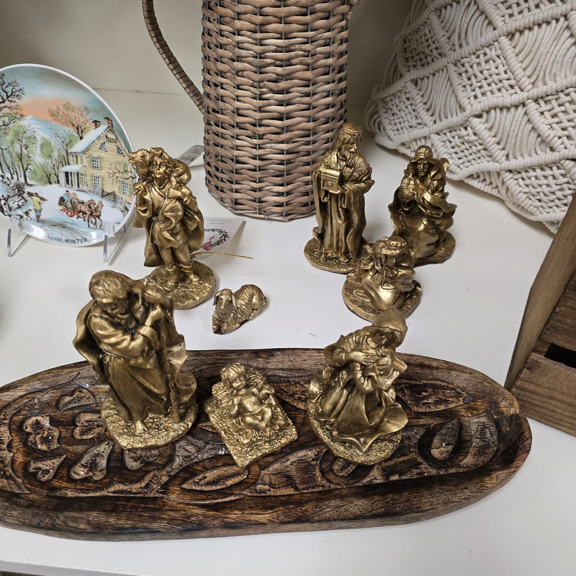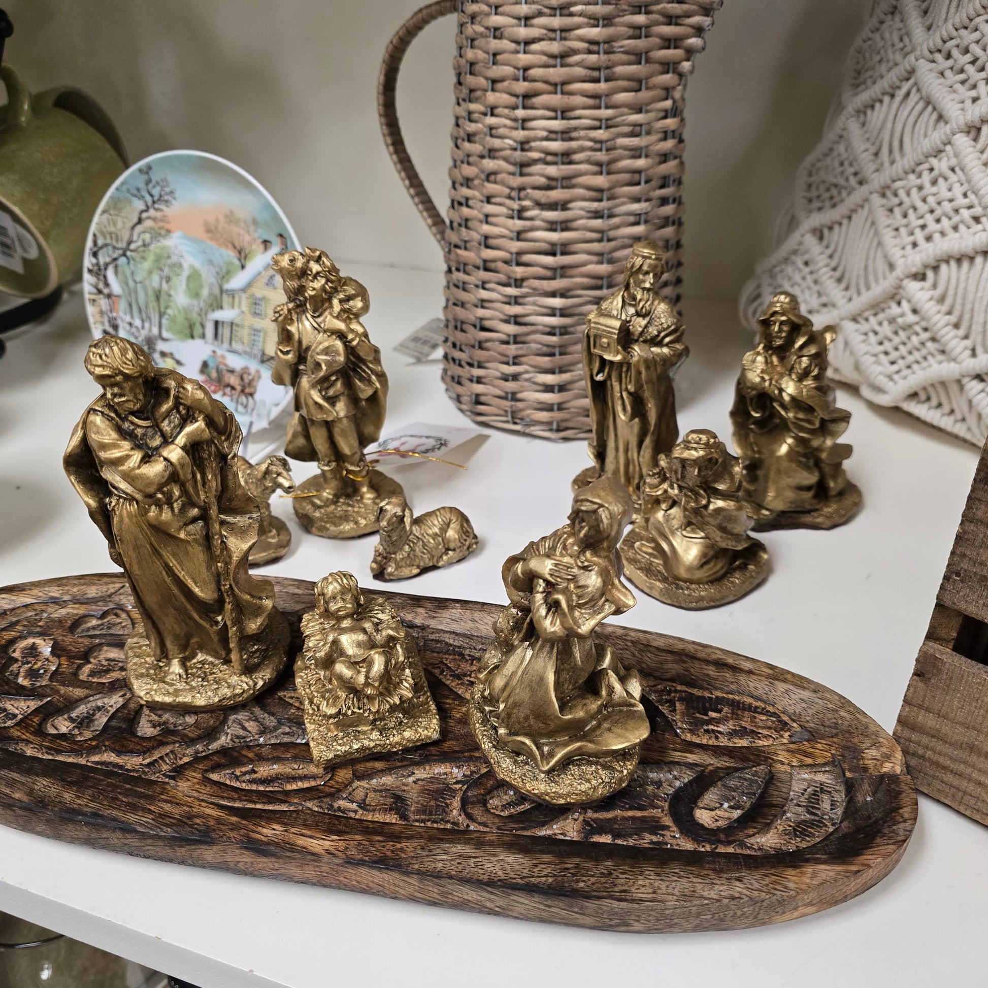 Celebrate the season with this charming hand-painted nativity set! Each of the nine carefully crafted pieces features a gorgeous gold antiqued finish that brings warmth and elegance to your holiday décor. Perfect for displaying on a mantel, shelf, or as a meaningful centerpiece, this set captures the magic of the nativity story with artistic flair. A delightful addition to your festive traditions that's sure to become a cherished keepsake year after year.