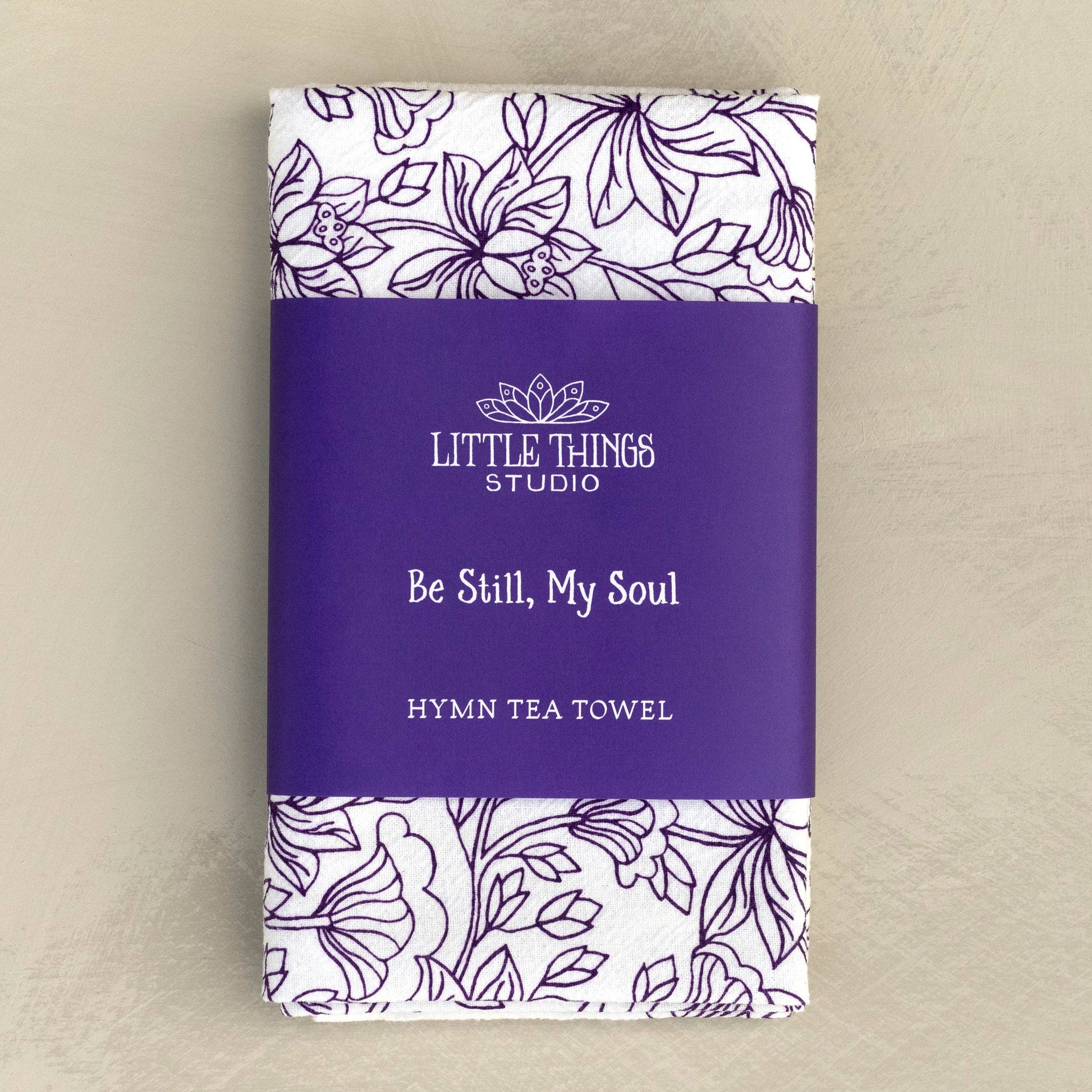 Our hymn tea towels brighten your home with color and song. The Be Still, My Soul hymn tea towel is printed in deep eggplant purple and features lyrics from the hymn. Made of 100% cotton, these flour sack tea towels easily and cost-effectively replace disposable paper towels with high absorbency and durability. Generously sized, lint free, and made to last a lifetime. Illustrated by Kate Whitley.