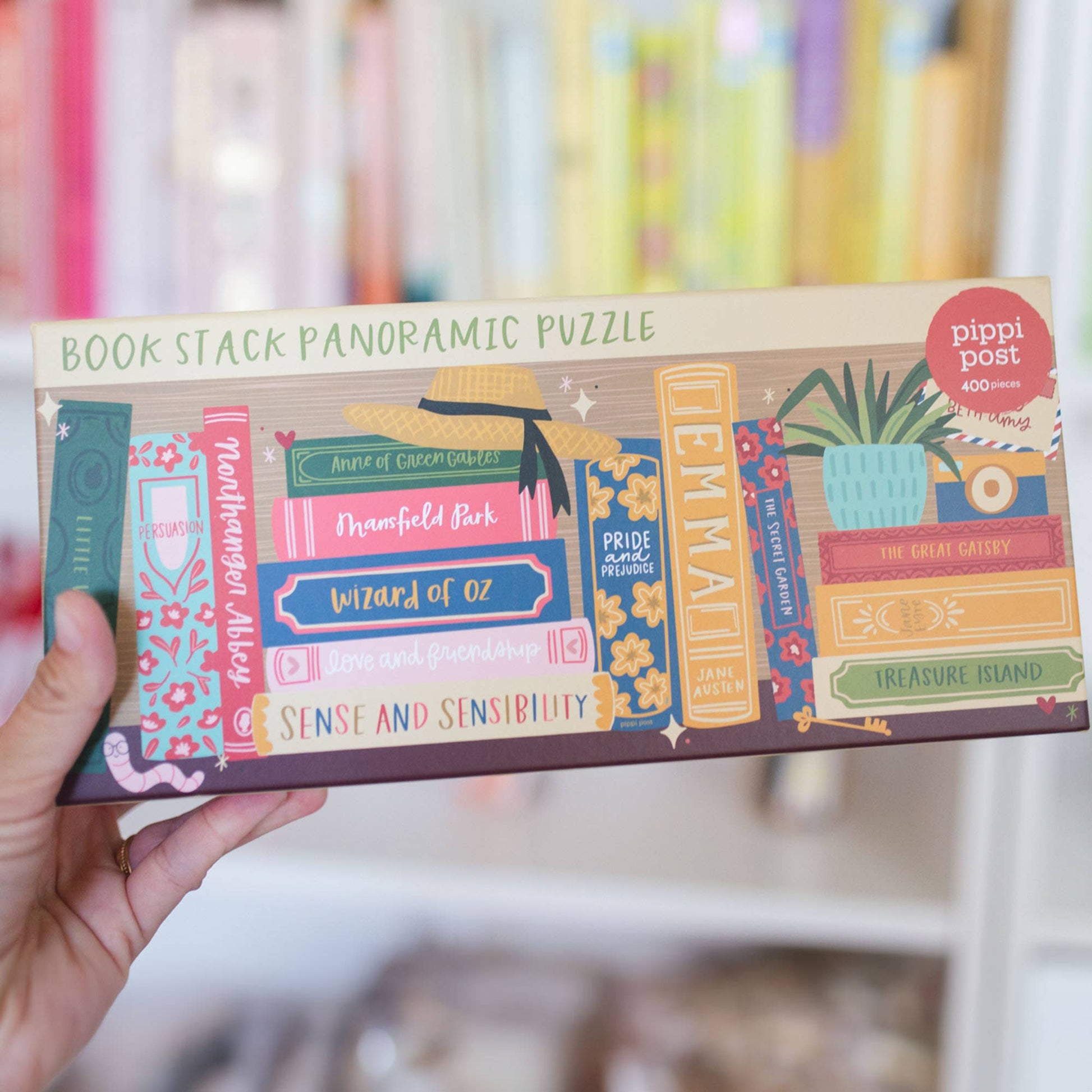 Piece together literary magic with our Classics Bookshelf 400 Piece Panoramic Jigsaw Puzzle! Featuring a unique panoramic shape and a hand-illustrated design, this puzzle is a must-have for book lovers and puzzle enthusiasts alike. Titles include beloved classics such as Little Women, Persuasion, Northanger Abbey, Anne of Green Gables, Mansfield Park, Wizard of Oz, Love and Friendship, Sense and Sensibility, Pride and Prejudice, Emma, The Secret Garden, The Great Gatsby, Jane Eyre, and Treasure Island. Whether you're gifting it to a bookworm friend, celebrating a special occasion, or simply treating yourself to some literary fun, this puzzle promises hours of entertainment and nostalgia. Get ready to piece together the beauty of classic literature in a whole new way!