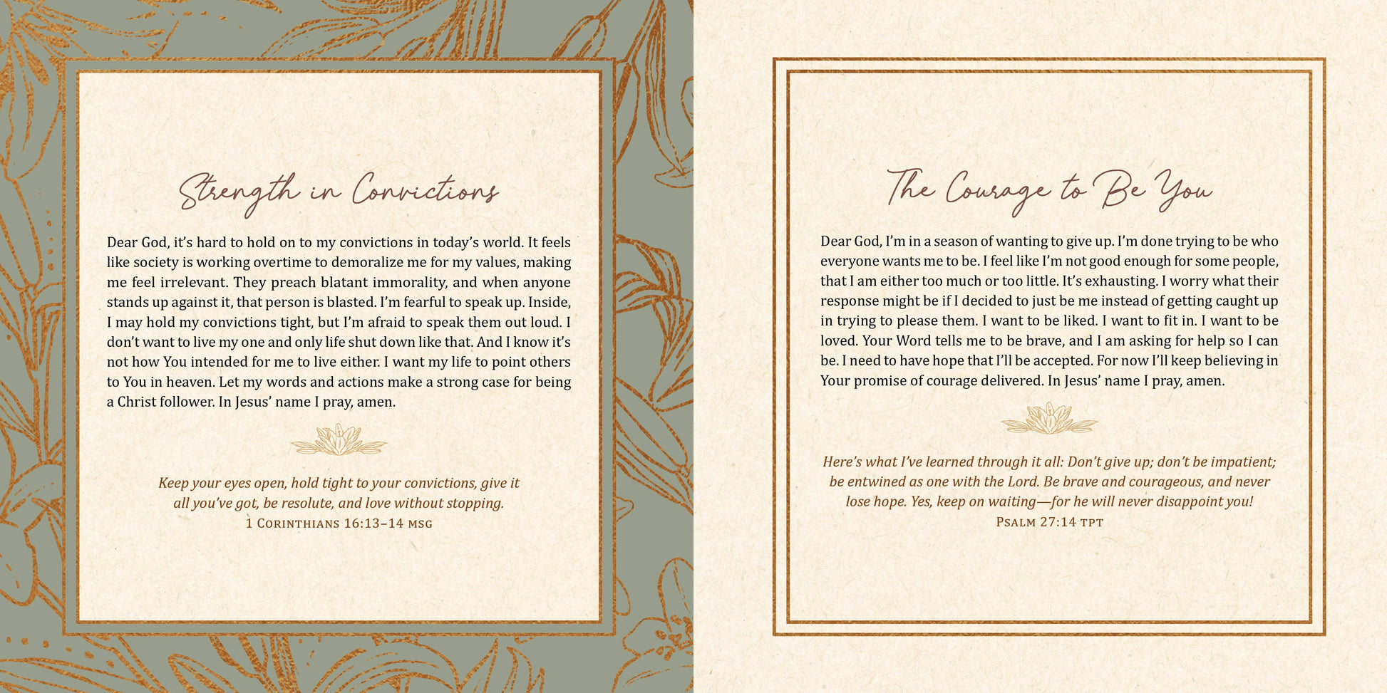 This lovely book will walk you through 200 encouraging, inspiring, heartfelt, courage-filled devotional prayers that will help your beautiful soul discover true trust and faith in Almighty God, the courage giver Himself. Every heartfelt prayer begins with a thought-provoking scripture selection and is meant to be a fear-free beginning to your very own personal prayer time.