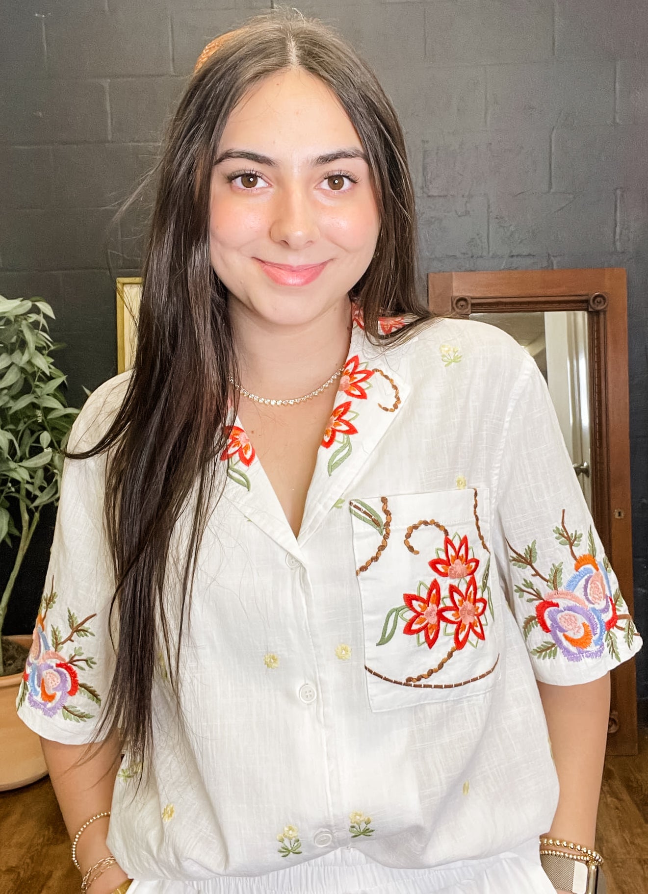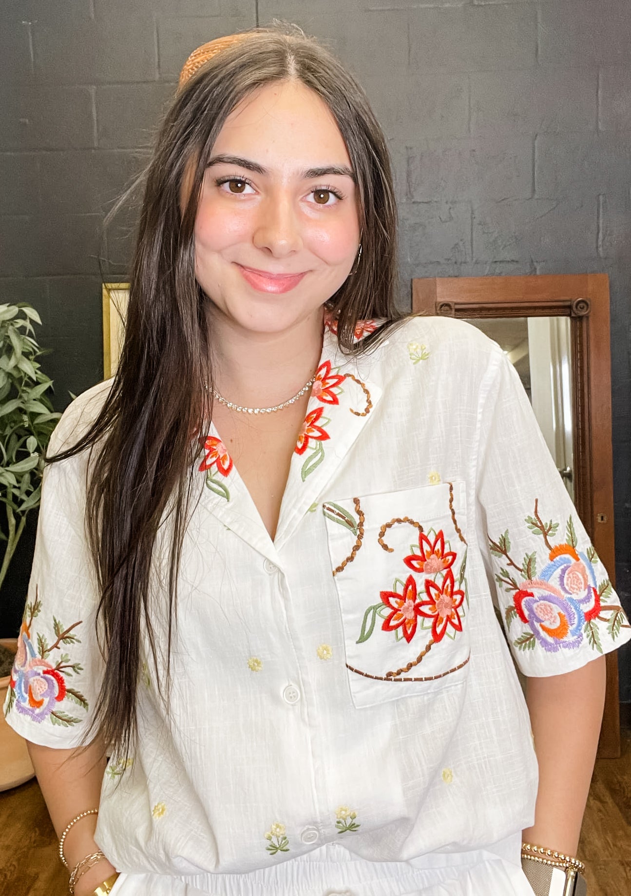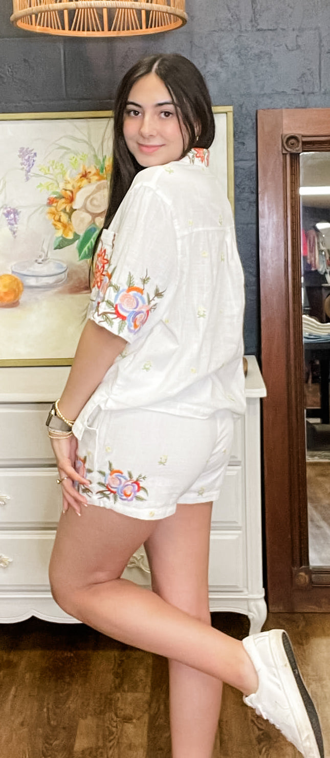 This set includes a cotton slub shirt and shorts. The top boasts fun embroidered motifs and a camp collar for a playful yet sophisticated look. Made with a premium fabric for comfort and style. Perfect for a day at the beach or a casual outing.