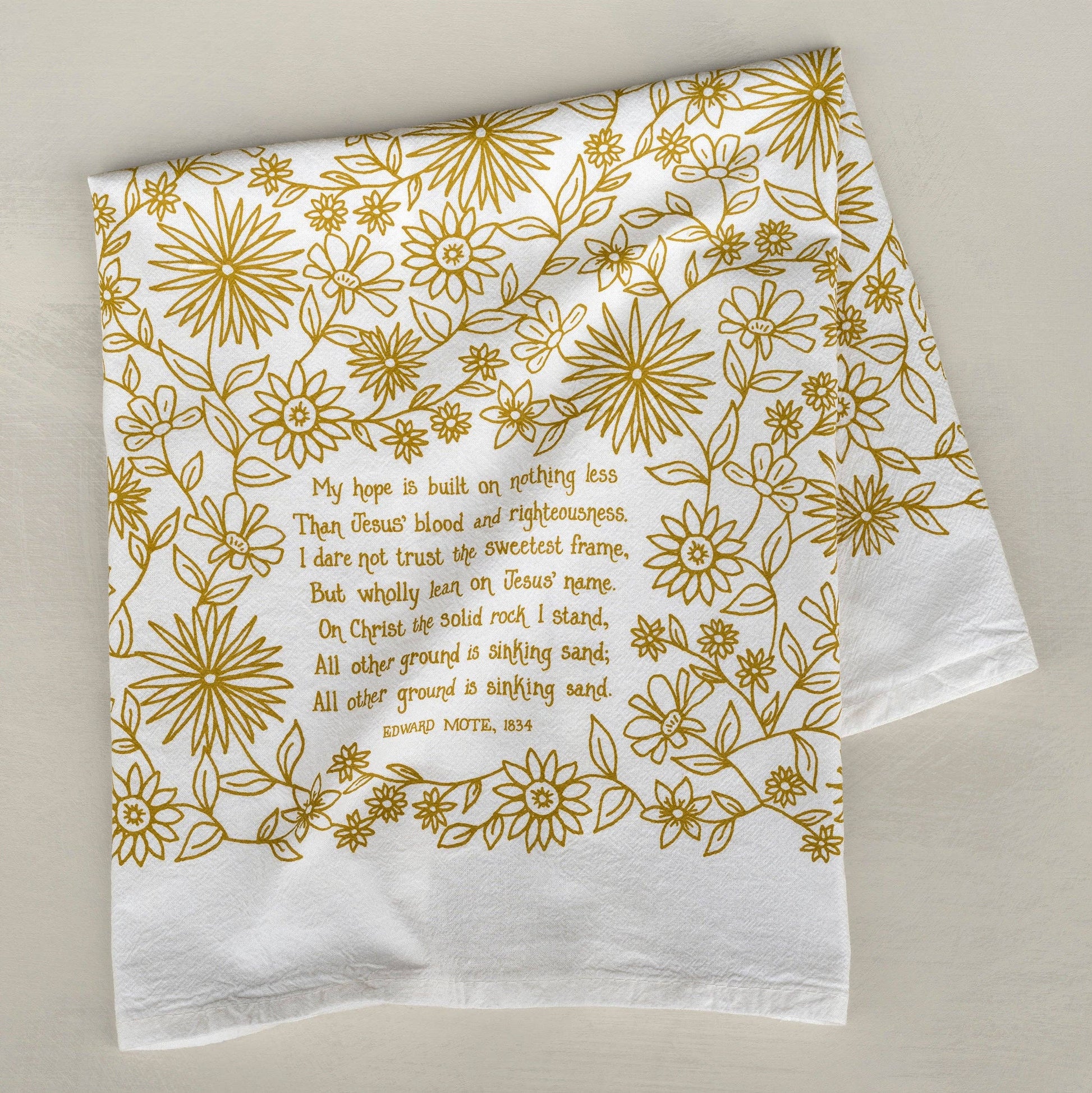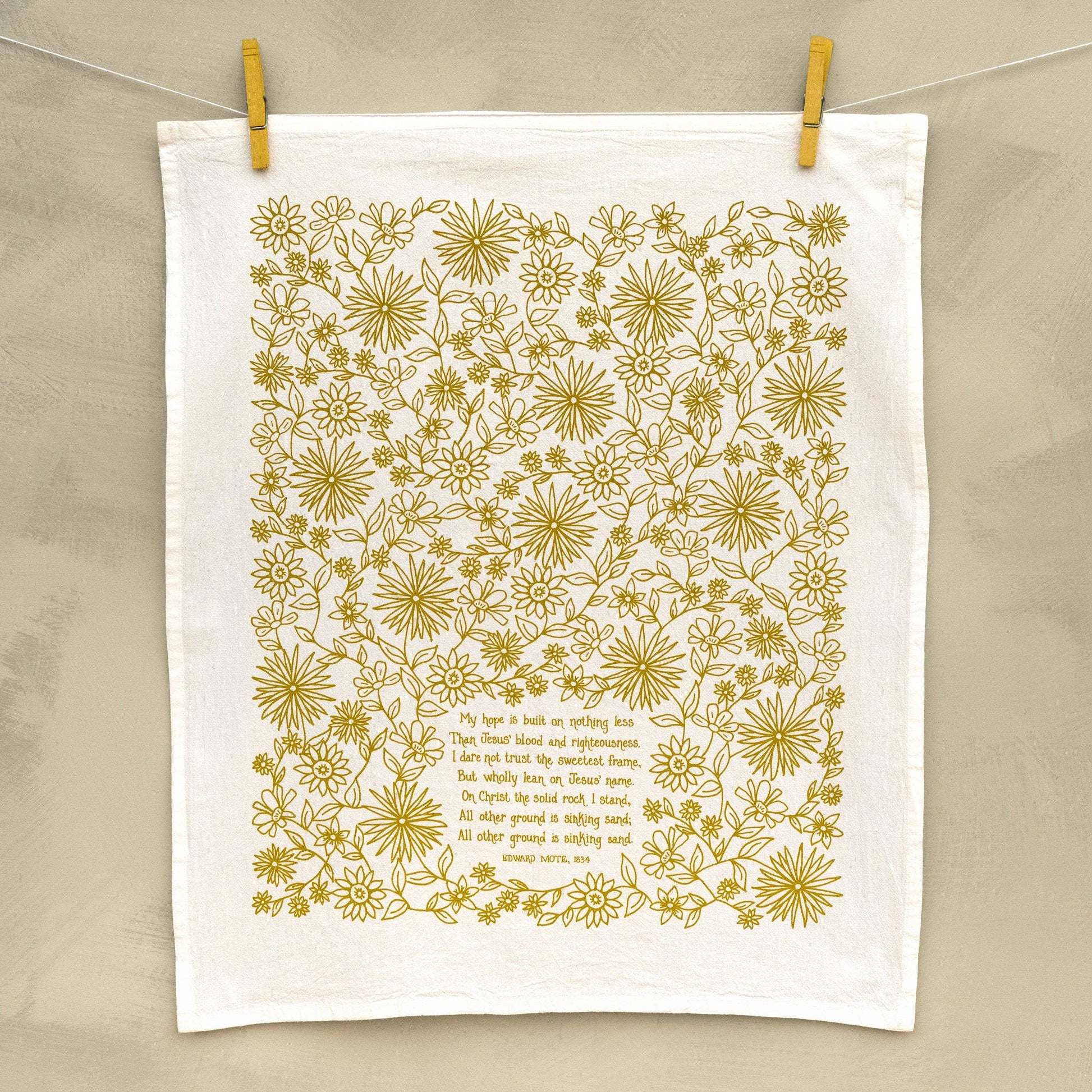 Our hymn tea towels brighten your home with color and song. The My Hope Is Built hymn tea towel is printed in Sicilian green and features lyrics from the hymn. Made of 100% cotton, these flour sack tea towels easily and cost-effectively replace disposable paper towels with high absorbency and durability. Generously sized, lint free, and made to last a lifetime. Illustrated by Kate Whitley.