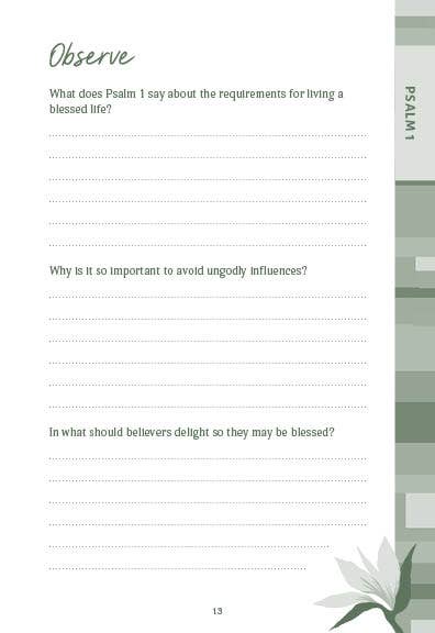 Featuring 30 studies highlighting key Psalms, this book walks you through the “inductive” study process of Observation, Interpretation, and Application. And it also includes thoughtful questions unique to each study.