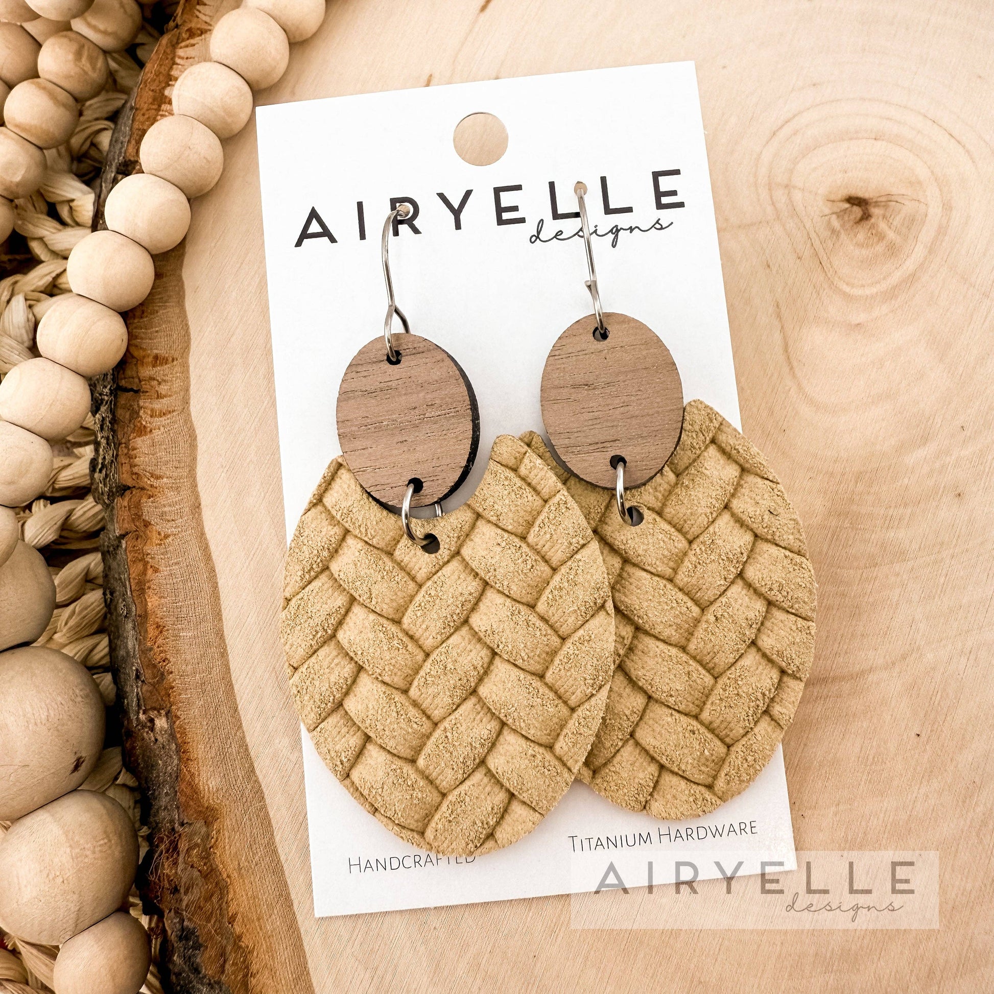 Materials: These stunning, elegant earrings are made from walnut wood and printed cork backed with 100% cowhide leather.