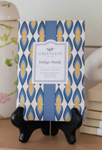 Experience the warm and sophisticated scent of our Indigo Suede Greenleaf Sachet. With hints of mandarin and currant, this elegant blend of atlas cedar, rose, sandalwood, and leather is as smooth as suede. Perfect for adding a touch of luxury to any space.