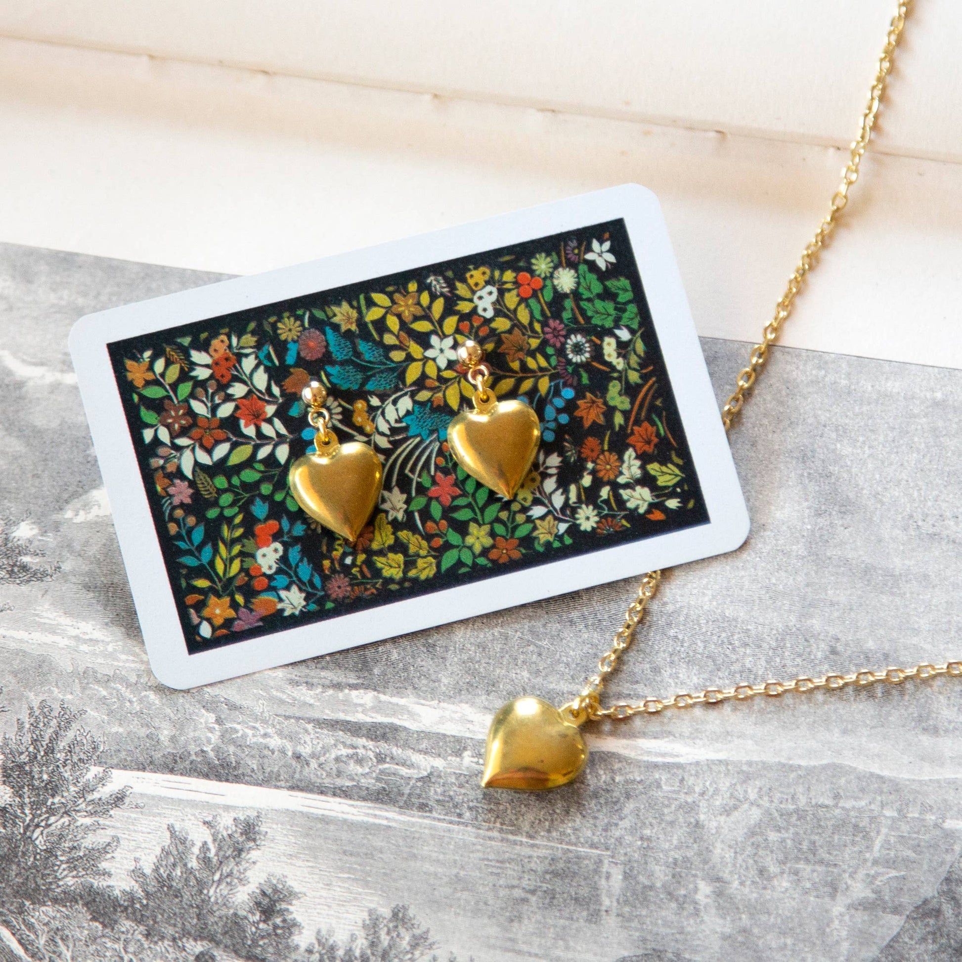 Deadstock vintage hollow brass puff heart charm earrings on gold vermeil posts (2X industry standard gold-plating on hypoallergenic, 100% recycled sterling silver). Hearts have some light, antique-looking petina. Matches our Vintage Brass Heart Charm Necklace!